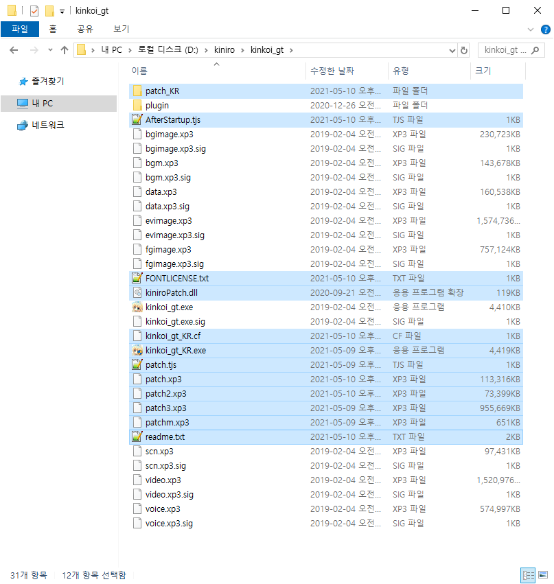 게임 설치 폴더 (kinkoi_gt.exe가 있는 폴더)로 한국어화 패치 zip 안에 있는 파일들을