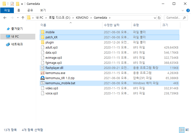 kemomusu.exe를 실행하면 게임이 실행됩니다.