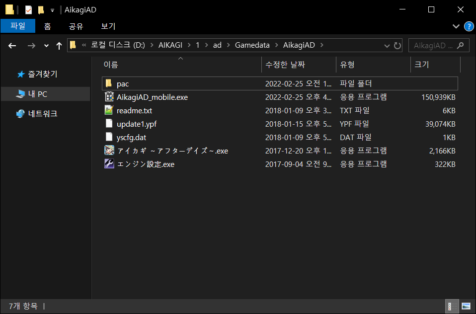 다음과 같이 아이카기 AD 게임이 설치 되어있는 경로로 압축을 해제 해줍니다.