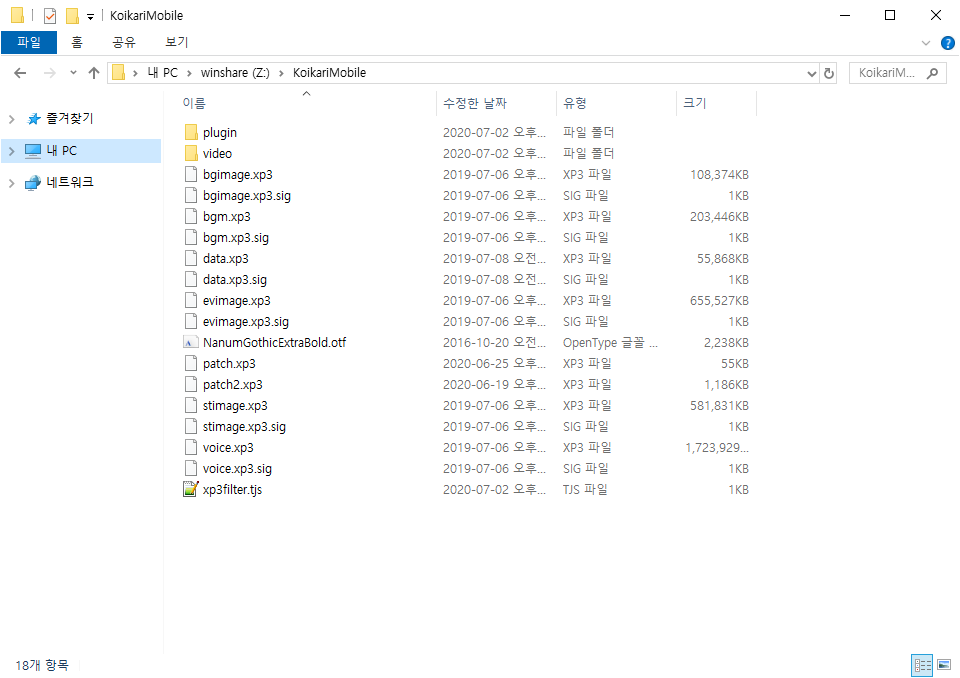 그리고 아래 스샷에 보이는 plugin, video 폴더 + xp3 파일들을 모두 복사해줍니다.