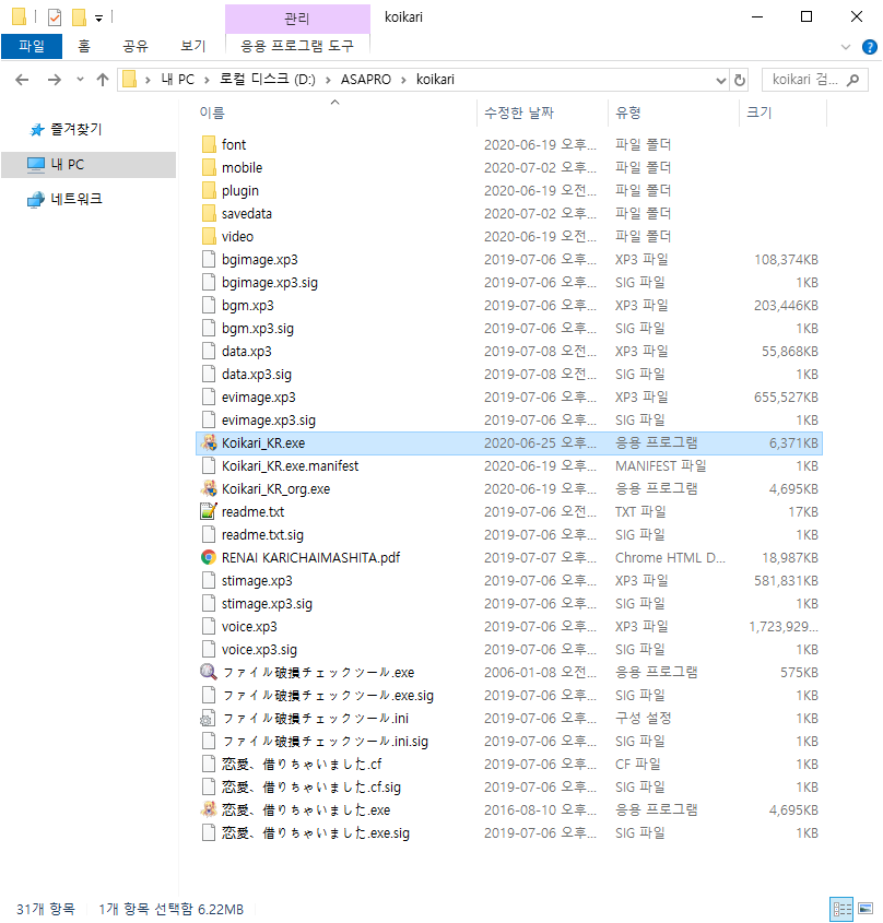Koikari_KR.exe를 실행하면 게임이 실행됩니다.
