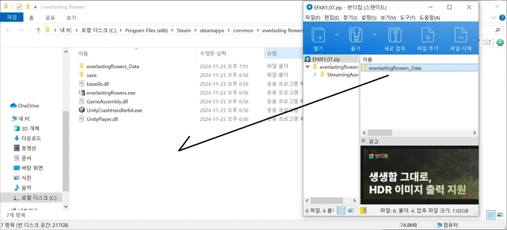 2. 한국어화 패치를 다운로드 받은 후, 상단 이미지와 같이 덮어씌워 주세요.