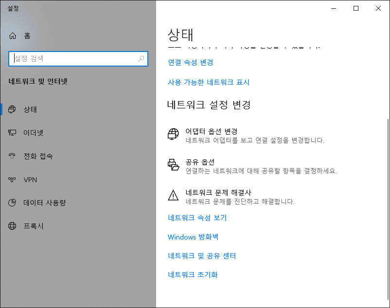 시작버튼있는 상태바 맨오른쪽에 네트워크 아이콘을 우클릭