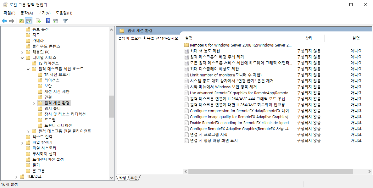 gpedit.msc -> 컴퓨터 구성 -> 관리 템플릿 -> 윈도우 구성요소 -> 터미널 서비스 -> 원격 데스크톱 세션 호스트 -> 원격 세션 환경