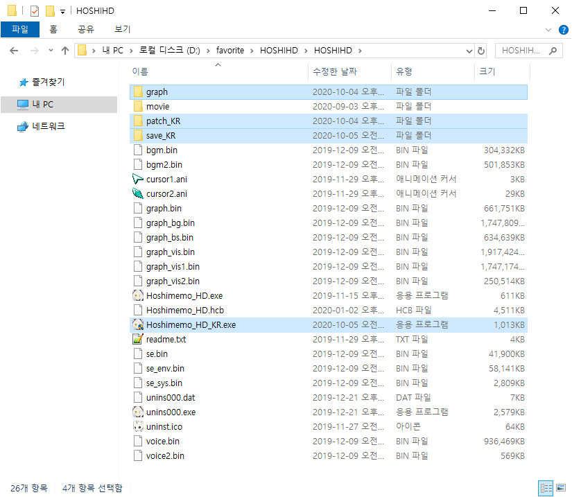 Hoshimemo_HD_KR.exe를 실행하시면 게임이 실행됩니다.