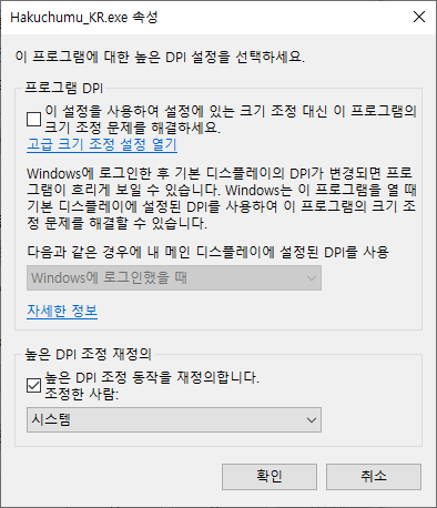 Hakuchumu_KR.exe 우클릭 -> 속성 -> 호환성 -> 높은 DPI 설정 변경 -> 높은 DPI 조정 재정의 -> 시스템 선택