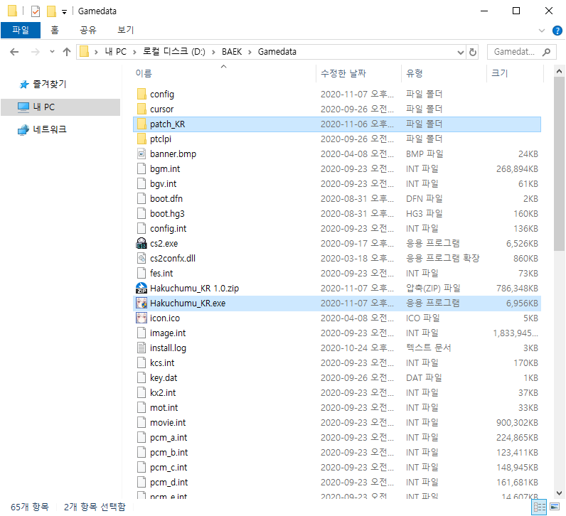 Hakuchumu_KR.exe를 실행하시면 게임이 실행됩니다.